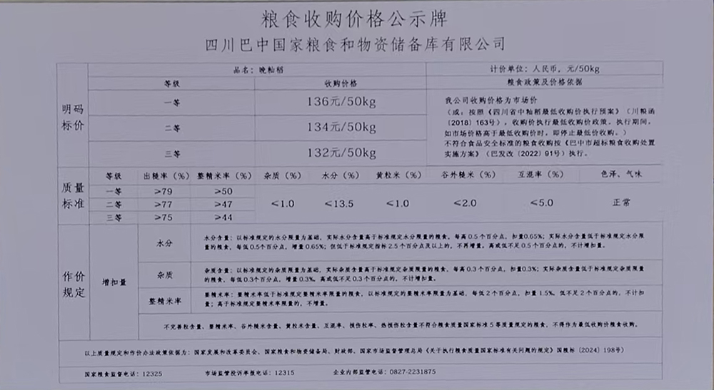 為認(rèn)真貫徹國(guó)家糧食收購(gòu)政策,全面落實(shí)省、市決策部署,踐行糧食安全黨政同責(zé)責(zé)任,充分發(fā)揮行業(yè)主體責(zé)任,做好秋糧收購(gòu)工作,切實(shí)保護(hù)種糧農(nóng)民利益?,F(xiàn)將四川巴中國(guó)家糧食和物資儲(chǔ)備庫有限公司2025年秋糧收購(gòu)相關(guān)信息公示如下: